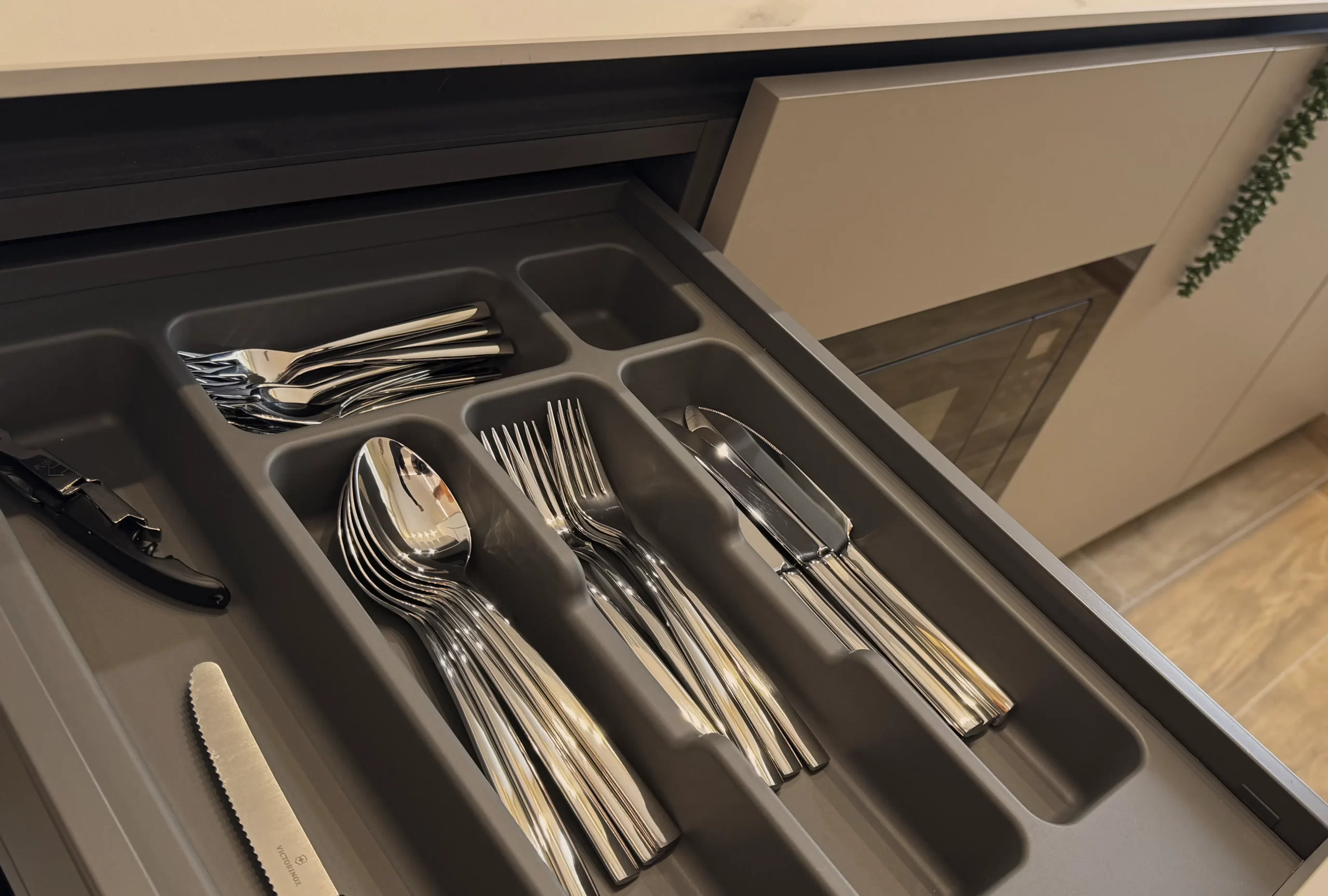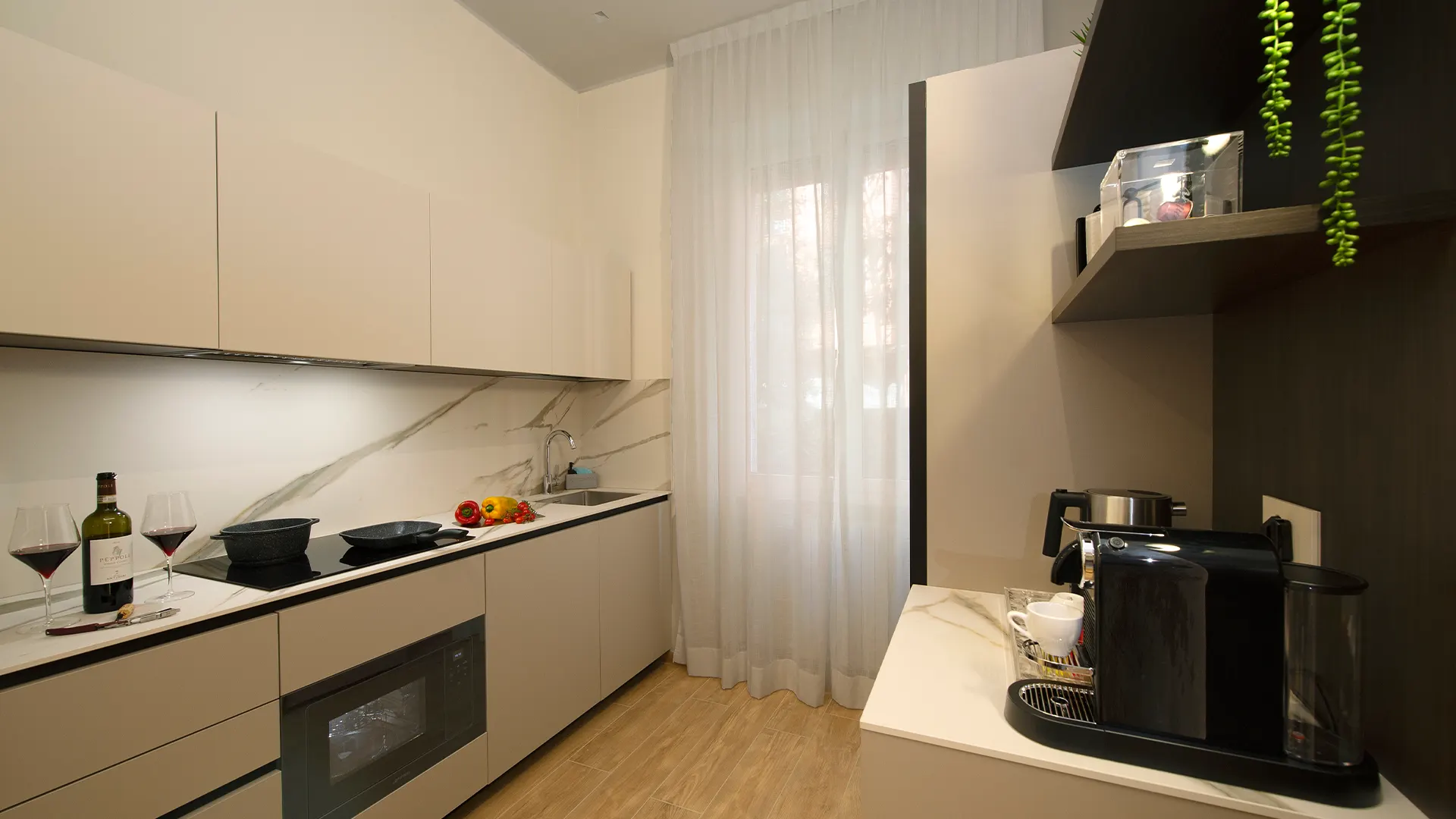 L’appartamento è composto da una cucina completamente attrezzata, dotata di tutto il necessario come fornello, forno microonde e frigorifero ideali per preparare pasti in totale autonomia, include inoltre lavatrice, asciugatrice e set da stiro completo di asse, perfetta per sentirsi come a casa anche in viaggio