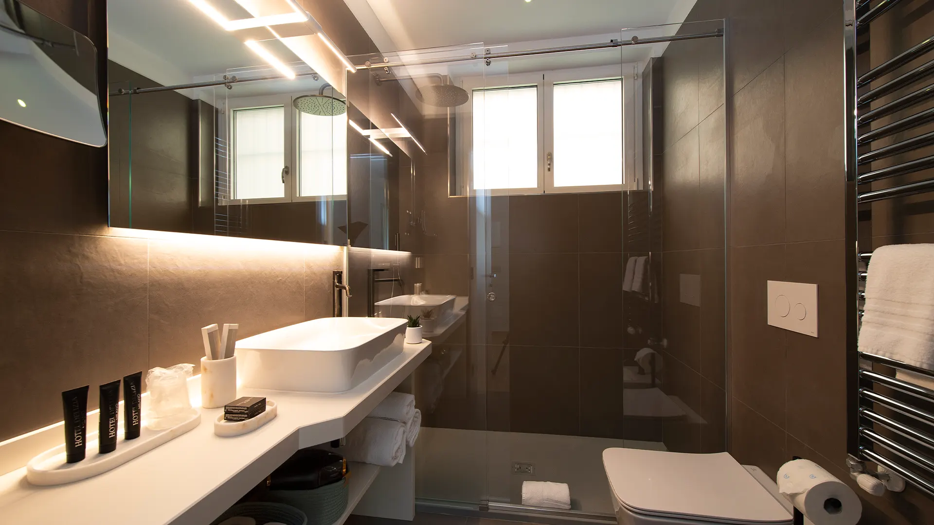 Una camera da letto padronale accogliente con TV dedicata, armadio ed un elegante divano, un bagno moderno con doccia, rifinito con materiali di pregio per il massimo benessere.